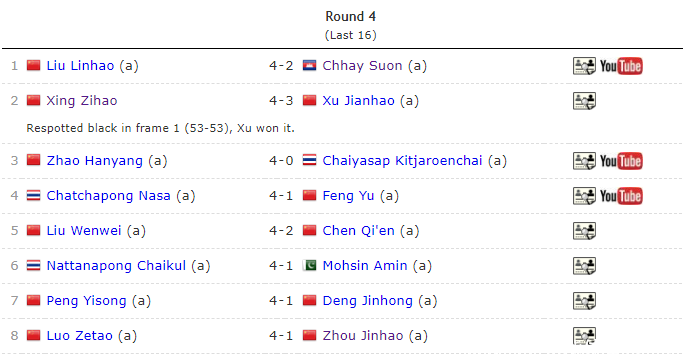 来到第四轮,出战的11名选手的弘扬依旧荒谬霸气,晋级8强的限额占到了5席,另外2个限额是人泰国选手。本轮,共有4场比赛是中国德比战,其他3场比赛是与外协会球员的比赛中。